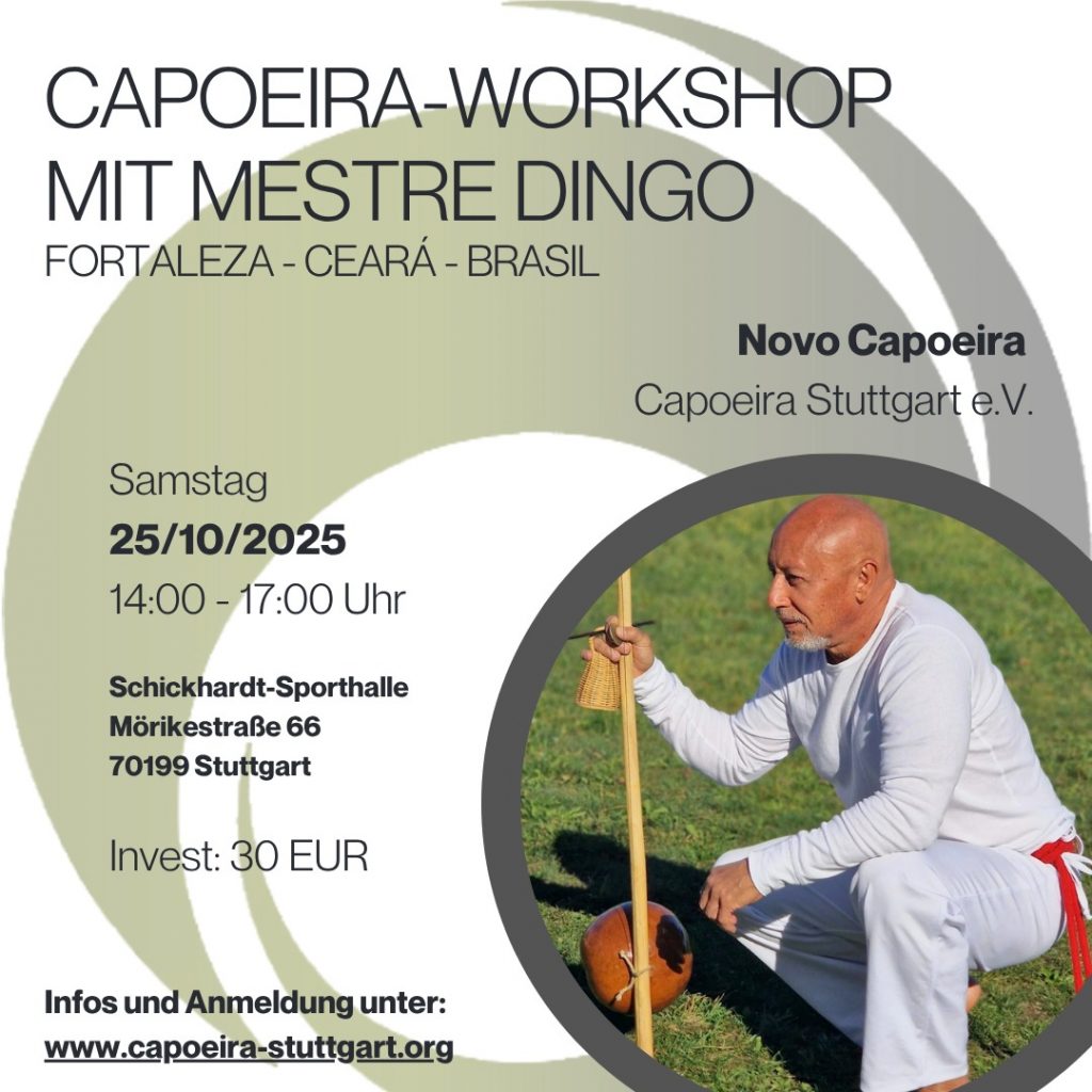 Am Samstag, 25. Oktober 2025 habt ihr die Gelegenheit, Capoeira hautnah mit Mestre Dingo aus Fortaleza (Ceará, Brasilien) zu erleben.